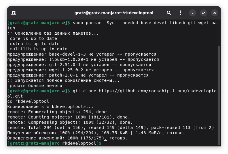 • Пакеты: base-devel, libusb (для сборки rkdeveloptool)