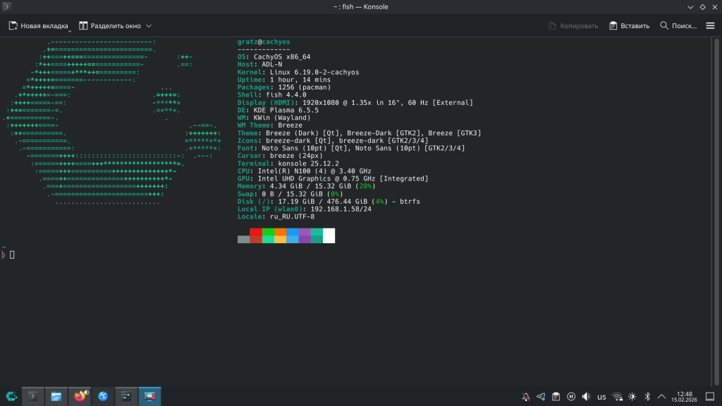 Так как в повседневной жизни я использую Manjaro со средой GNOME, логично было попробовать что-то из семейства Arch. Выбор пал на CachyOS с рабочим столом KDE Plasma.